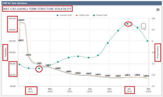 天然氣期權交易有下面兩個特點:第一冬季月份的天然氣期權隱含波動率要比其他季節(jié)高得多,請看下面圖5中綠線。